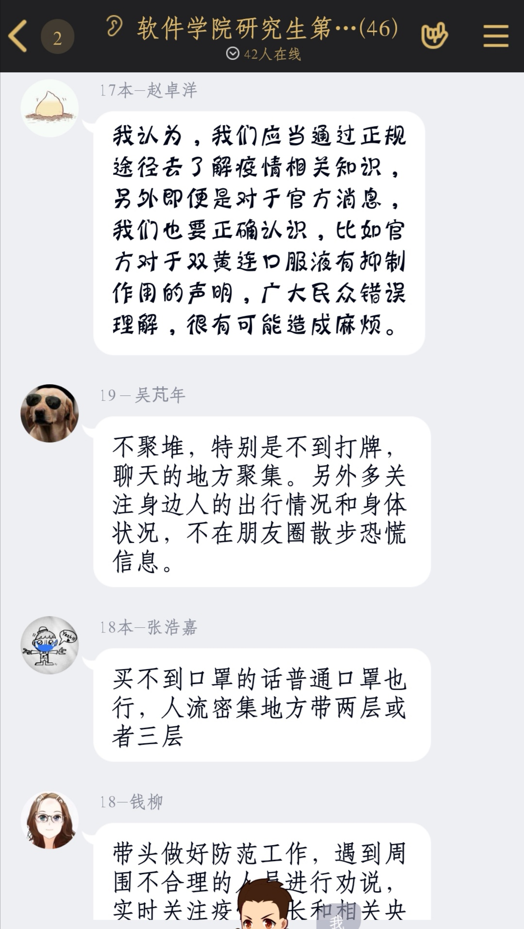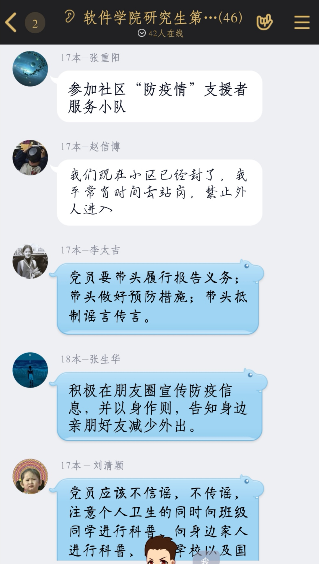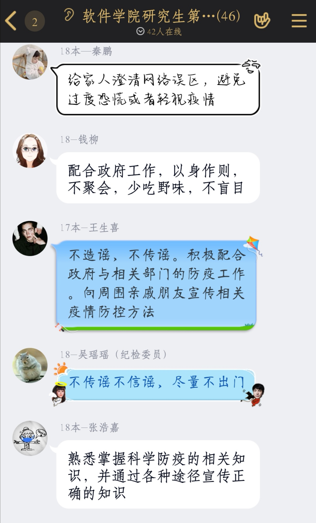 面对这举世关注的严峻疫情,软件学院研究生第三党支部的党员同志们行动起来了。因条件所限虽身不能至抗疫一线,但他们也尽自己绵薄之力,力所能及为抗疫防疫做一些属于青年学生党员应该做的事情。