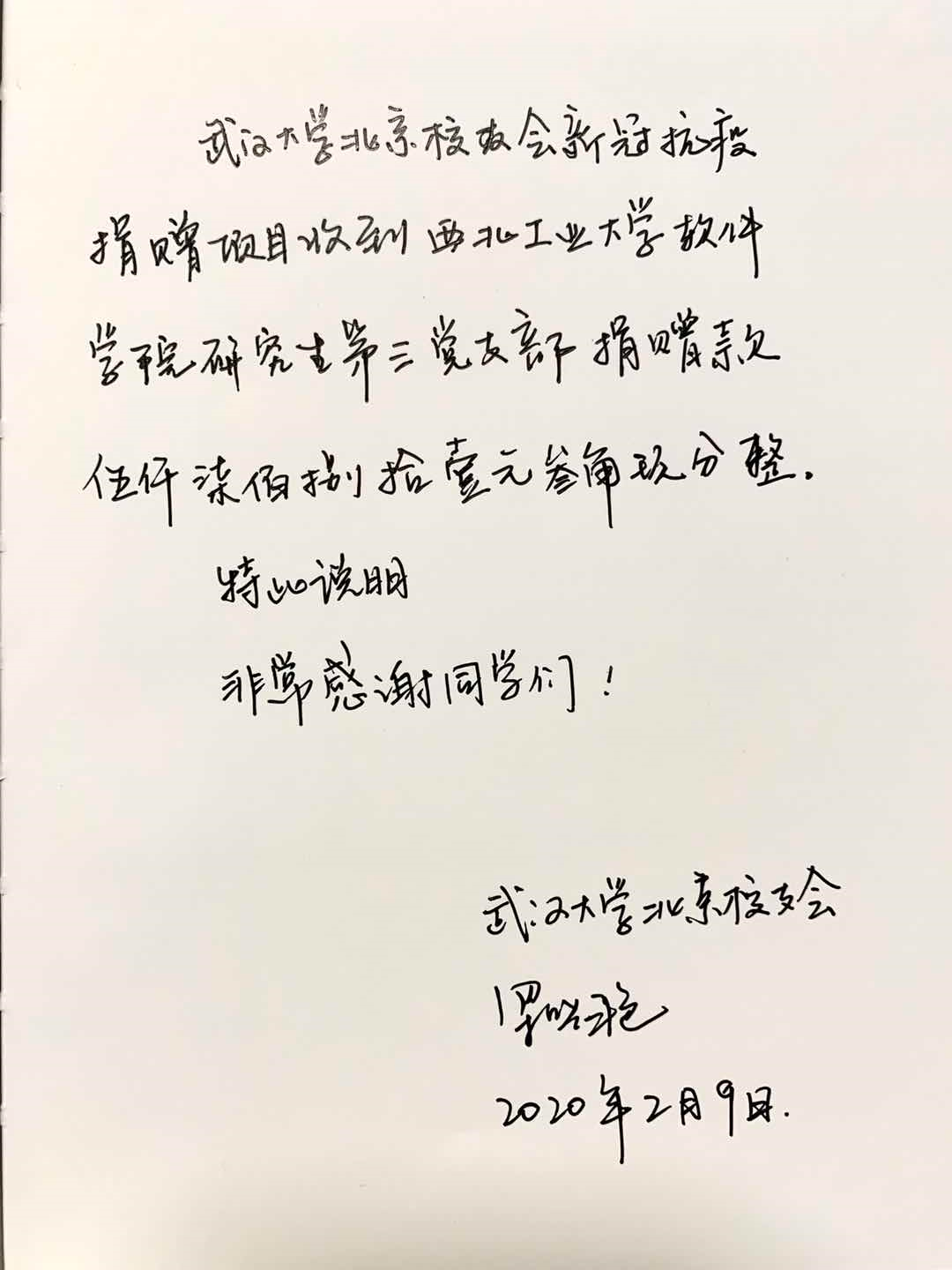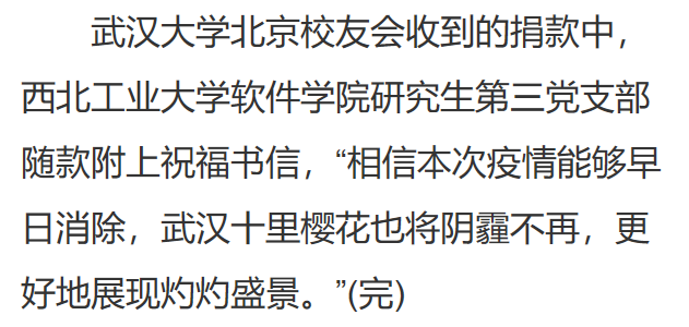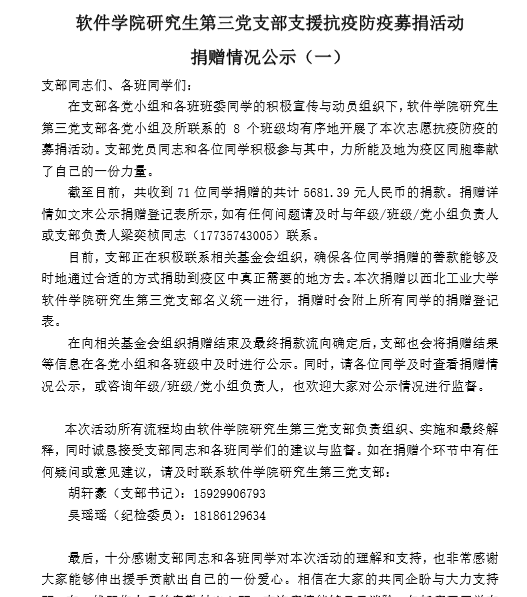支部还发起了支援募捐活动。募捐活动主要面向本支部和党小组所联系的8个班级。在募捐活动发起后,各党小组及所联系的8个班级均有序地开展了募捐,最后共募捐所得5700余元人民币。通过与武汉大学北京校友会联系,商定委托该组织利用其校友等渠道购买防疫物资并运送到湖北疫区一线,软件学院研究生第三党支部将同学们的爱心送到前线真正需要的医护人员手中去。整个过程中,支部将募捐及捐赠情况进行两次及时公示,确保募捐活动各流程透明公开。最后,武汉大学北京校友会向支部同学们表达了感谢,相关内容也被中国新闻网、武汉大学北京校友会等媒体网站上进行报道。