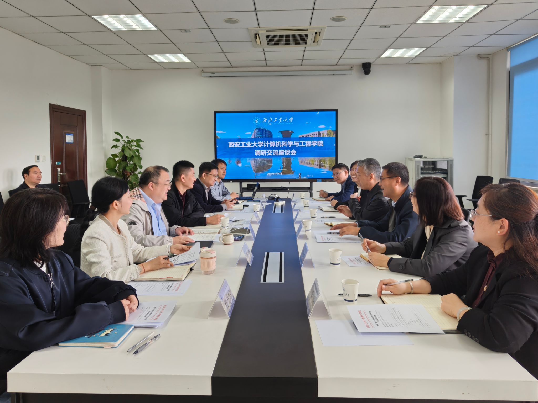 为加强校际合作,推动学科建设与科研合作高质量发展,2026年4月13日上午,西安工业大学计算机科学与工程学院一行10人赴软件学院调研交流。本次调研交流座谈会由学院院长郑江滨主持,双方学院领导及教师代表参加会议。