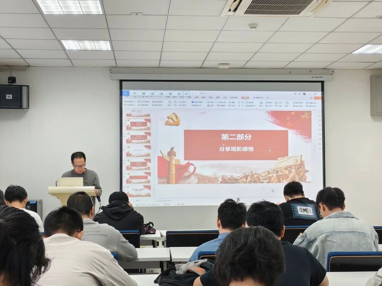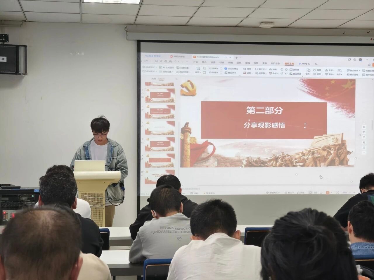 观影结束后,进入“观影感悟”环节。党员代表们依次分享观影感悟。研究生第七党支部的冯柯胜同志表示,先烈们的英勇事迹让他深受鼓舞,作为新时代的青年党员,要铭记历史,以史为鉴,努力学习,为祖国的繁荣富强贡献自己的力量;研究生第五党支部的宋晋同志表示,纪录片中展现的那段历史,让我对‘九一八’事变有了更深刻的理解。这不仅是一段屈辱的历史,更是一段觉醒的历史。它让我明白,作为新时代的青年党员,我们不能忘记历史,要从历史中汲取力量。其他支部的代表也纷纷发言,表达了他们对“九一八”事变的深刻感悟和对未来的坚定信念。